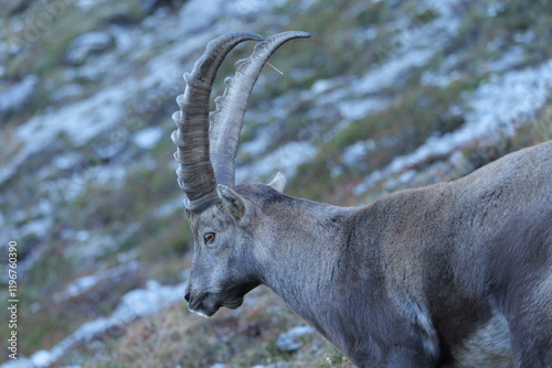 Männlicher Steinbock Nahaufnahme Alpen Vorarlberg Österreich