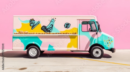 Mobile bakery truck with bold pop culture designs, serving themed pastries in a trendy district