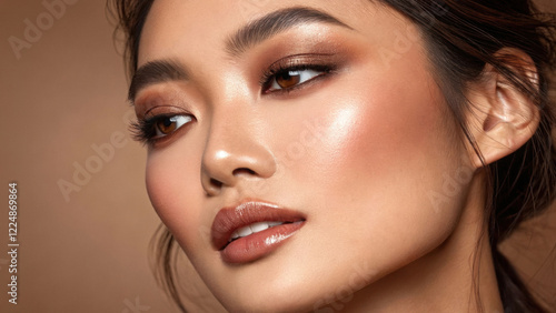 Mocha mousse makeup, 2025 Color Trend. Close-up of a woman showcasing radiant makeup with glossy lips and shimmering eyeshadow.