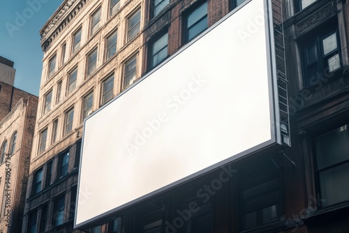 Mock up image: wide blank white billboard or large screen attached to a building. Consumerism, mockup, advertising, isolated white screen, background, template, copyspace concept