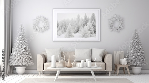 Mock up poster frame in interior scandinavian christmas and winter decoration. Generative AI
