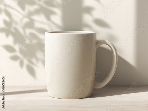 Mockup ceramicznego kubka z cieniem liści na beżowym tle