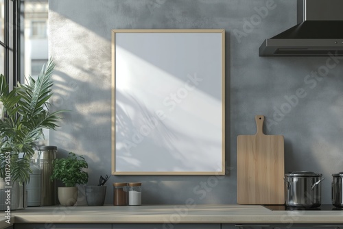 Mockup de moldura vertical em cozinha moderna com utensílios, plantas e decoração minimalista, criado com IA generativa para visualização de arte e design