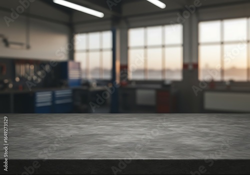 Mockup empty workbench in a blurred auto repair shop with large windows commercial usage