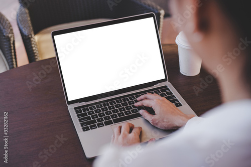 mockup image blank screen computer with white background for advertising text,hand woman using laptop contact business search information on desk at coffee shop.marketing and creative design