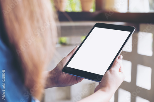 Mockup image of a woman holding black tablet pc with blank white desktop screen in cafe