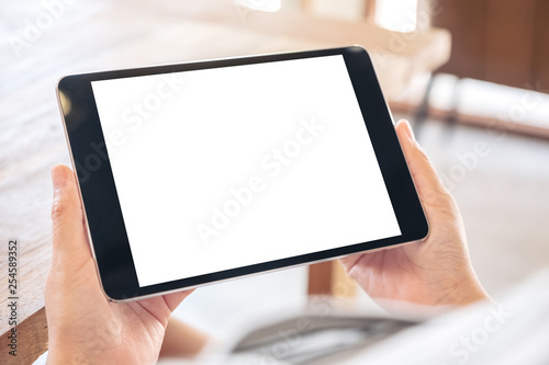 Mockup image of a woman holding black tablet pc with blank white screen horizontally