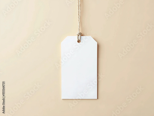 Mockup of a blank rectangular paper label attached to a thin string, resting on a neutral beige surface.