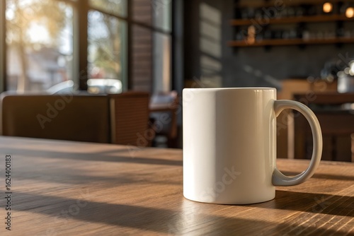 Mockup of a ceramic coffee cup on a wooden table with natural lighting. Design illustration.