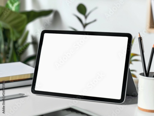 Mockup of iPad with Blank White Screen in Minimalist Desk Setting
