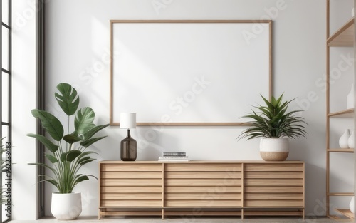 Mockup poster frame in modern interior with white wall and wooden console, home interior with plant, 3d rendering