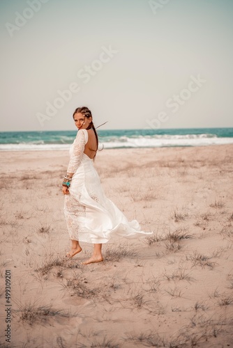 Model in boho style in a white long dress and silver jewelry on the beach. Her hair is braided, and there are many bracelets on her arms.