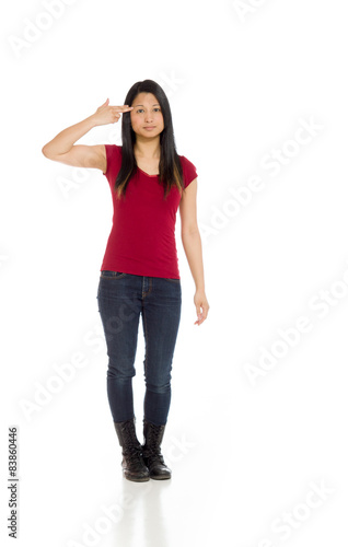 despair, hand, stress, suicide, adult, annoyed, asian ethnicity, beautiful, casual attire, copy space, cut-out, cute, denim, depressed, female, finger, finger, full-length, gesture, girl, gun, isolated, isolated on white, jean, long hair, mexican, model, one person, pant, people, person, red, signs, standing, student, studio shot, t-shirt, white background, woman, young adult