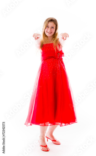 children, sharpened, nightlife, beautiful, caucasian, copy space, cut-out, cute, dress, evening gown, female, finger, front, full-length, gesture, girl, isolated, isolated on white, children, long hair, model, one person, people, person, pointing, red, standing, student, studio shot, teenage, well-dressed, white background, woman, young