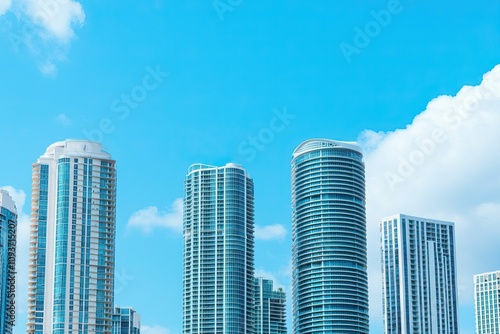 model modern design and avant-garde, A vibrant skyline featuring modern skyscrapers against a clear blue sky with fluffy clouds.