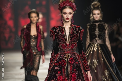 fashion, runway, model, gown, evening dress, autumn, show, design, elegance, haute couture, apparel, striking, beauty, costume, artistry, catwalk, designer, style, aesthetic, trend, glamourous, red, black, embroidery, sophistication, showcase, luxury, haute couture, event, presentation, audience, creativity, make-up, hair, accessory