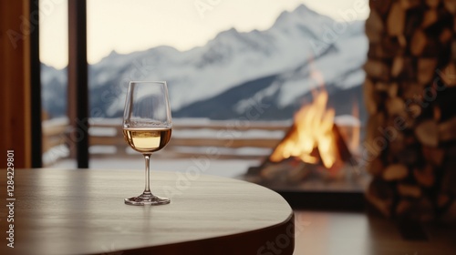 moderate, drinking, mountain, filed, luxury, nature, cosy, retreat, travel, winter, vacation, content, scene, glasses, wine, wooden, table, snow-capped
