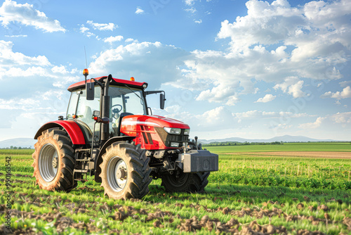 Modern Agricultural Machinery Tractor in a Lush Farm Field with Copy Space