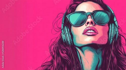 Modern and cool woman listening music on headphones with smiley and happy attitude on trendy color background