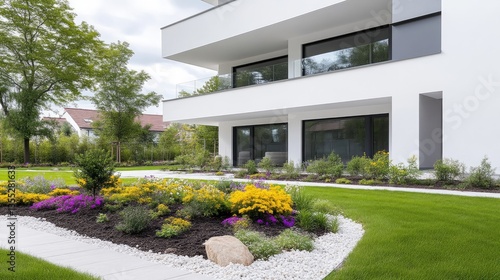 apartment, building, house, modern, exterior, landscaping, garden, lawn, courtyard, patio, balcony, window, tree, plant, flower, shrub, design, home, property, contemporary, urban, residential, luxury, stylish, elegant, white, grey, balustrade, paver, gravel, stone, maintenance, beautiful, new, fresh, peace, calm, green, space, peaceful, cosy, dream, estate, investment, view, detail