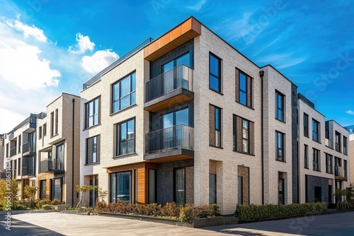 building, architecture, apartment, modern, contemporary, home, residential, exterior, facades, window, balcony, glasses, brick, concrete, stone, design, urban, city, real estate, property, development, housing, new, luxury, style, structure, construction, skyline, sky, blue, cloud, sunny, day, bright, daylight, front, street, path