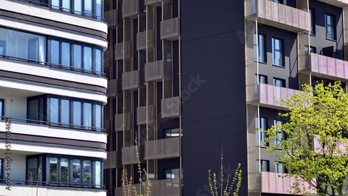 Modern apartment buildings on a sunny day with a blue sky. Facade of a modern apartment building. Contemporary residential building exterior in the daylight.