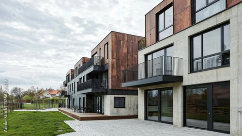 apartment, building, complex, architecture, modern, exterior, design, concrete, rustic, metal, window, balcony, residential, housing, property, real estate, structure, contemporary, facades, urban, landscape, grass, daytime, grey, brown, style, home, construction, development, living, space, house, estate, building exterior, architectural