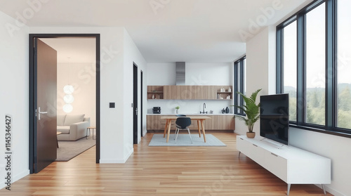Modern Apartment Interior with Open Kitchen and Living Area