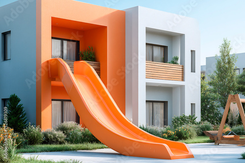 Modern apartment with vibrant orange balcony and slide feature, surrounded by landscaped greenery and playful elements in a sunny outdoor setting