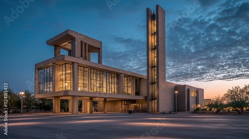 architecture, building, modern, contemporary, design, structure, dusk, evening, twilight, sunset, sky, cloud, light, illuminated, window, glasses, facades, concrete, stone, tower, tall, high, piazza, exterior, urban, landscape, desert, scene, image, photo, photo, real estate, property, development, construction, geometrical, line, shape, space, aesthetic, beauty, impressive, grand, elegant, monumental, stylish