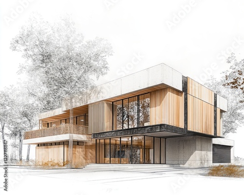 house, modern, architecture, design, vignetting, tree, wood, concrete, window, balcony, landscaping, home, building, contemporary, style, residential, dwelling, exterior, facades, elevation, drawing, illustration, plan, blueprint, concept, visual, image, rendering, perspective, minimalist, aesthetic, line, detail, structure, property, real, estate, urban, nature, environment, artistic, creative