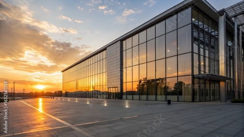 Modern architecture featuring a glass facade reflecting the warm hues of the setting sun in an urban landscape