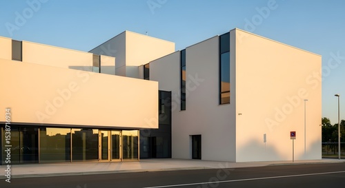Modern architecture with geometric shapes and golden hour light reflecting in glass doors.