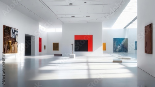gallery, modern, art, white, interior, roomy, bright, minimalist, contemporary, painting, sculpture, light, empty, clean, sun, shadow, floor, wall, ceiling, display, exhibit, abstract, colourful, geometric, sunlit, exhibit, design, museum, architectural, architecture, space
