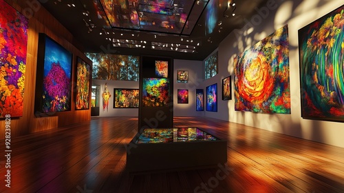 gallery, art, modern, abstract, painting, colourful, interior, wall, room, exhibition, display, design, contemporary, style, wooden, floor, light, shadow, showcase, decor, structure, concept, culture, inspiration, creativity, frame, fine, visual, aesthetic, artwork, collection, museum, space, illuminated