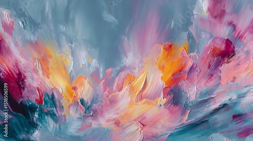 Modern art: Oil and acrylic paints are smeared and blotted on a canvas. This abstract painting has pastel colors and brushstrokes.