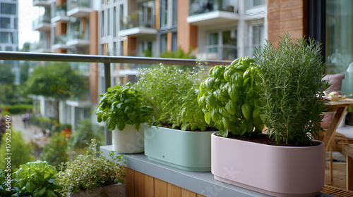Modern balcony garden pastel planters herbs, balcony herb garden soft morning light, fresh herbs modern balcony garden design Urban Balcony Gardens, Fresh Herb Lifestyle, Modern Small-Space Gardening