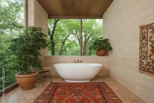 Modern bathroom interior featuring a freestanding bathtub with a beautiful view of greenery, conveying relaxation and serenity in a stylish environment