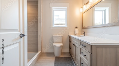 Modern bathroom interior, white walls, light fixtures, vanity, and shower. Possible use Home design inspiration