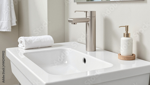 bathroom, sink, modern, design, accessory, white, neutral, towel, decor, washbasin, hygiene, cleanliness, contemporary, minimalist, elegance, home, lifestyle, interior, simplicity, essential, fresh, stylish, comfort, relaxation, organisation, softness, functionality, home decor, spa, beauty, luxury, soothing, practical, renovation, trend, freshen, relaxing, calming, urban, bright, inviting, aesthetic, warm, bathe, privies, faucet, clean, room