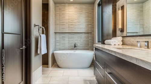 bathroom, tub, modern, design, interior, decor, tile, luxury, clean, white, elegant, space, relaxation, towel, fixture, contemporary, natural, bright, home, architecture, shower, sink, faucet, serene, style, comfort, warm, aesthetic, wall, tone, fashionable, setup, minimalism, simplicity, cosy, environment, atmosphere, lighting, renovation, chic, material, countertop, hardware, ambience, flooring, relaxing, harmony, calmness, beauty