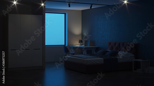 Modern bedroom interior. Bedroom with blue walls. Night. Evening lighting. 3D rendering.