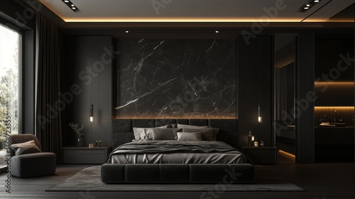 bedchamber, interior, design, modern, bed, furniture, luxury, architecture, room, black, dark, grey, lighting, style, elegant, contemporary, minimalist, decor, home, space, view, perspective, window, wall, texture, shadow, light, wood, pillow, blanket, comfort, visualisation, concept, residential, inside, property, apartment, house, structure, day, clean, lifestyle, calm, relax, indoor, serene, empty