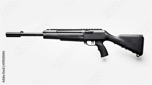 Modern black assault rifle with optical sight and red trigger, isolated on white background in studio setting