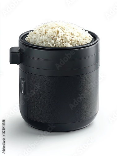 Modern Black Rice Cooker with Cooked Rice on Top Against a White Background
