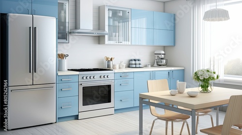 modern, blue, white, silver, illustration, kitchen, cabinet, appliance, sleek, clean, line, minimalist, design, fresh, inviting, space, functional, stylish, background