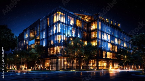 building, modern, architecture, night, city, light, window, illuminated, dark, geometric, tree, street, wet, calm, peaceful, urban, design, contemporary, evening, nightlife, skyscraper, city landscape, glasses, facades, structure, urban scene, night view, illumination, exterior, city lights, night photography