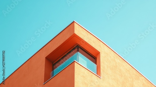Modern building corner, bright orange facade, clear sky, architectural detail, urban scene, great for presentation, ideal for poster