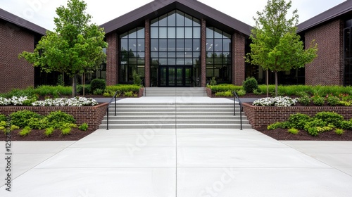 building, entrance, landscaping, modern, architecture, exterior, front, design, campus, structure, garden, tree, plant, pathway, stone, concrete, front view, brick, glasses, entranceway, contemporary, ground, facility, commercial, property, facades, architectural, formal