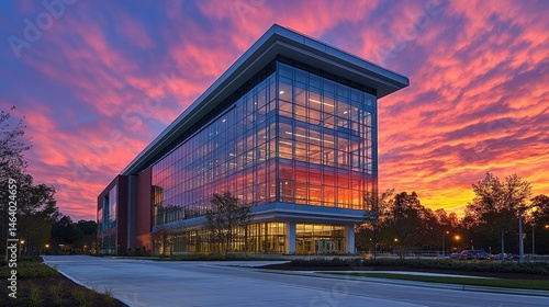 Modern building reflecting colorful sunset sky with trees and road in front